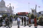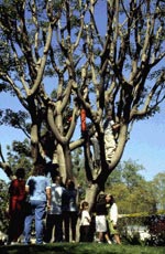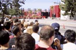 さて、私は当日、ファンに混ざって会場に行ってみた。集まった人々は、通りをはさんだ大学のキャンパス沿いに、幾重もの人垣を作っていた。木に登って見る人までいる。記念Tシャツを売る人も現れた。「15ドルだよ~」という売り言葉に「さっき10ドルって言ったよ」という買い言葉。そうこうしているうちに、続々とリムジンが…。 |