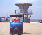 発売元は、宣伝活動の一環としてロサンゼルス地区の砂浜一帯に、公開当時のポスター(海上にいる人に向かってサメが大きく口を開けている映画ファンおなじみのヤツ)をゴミ箱などに貼った。しかし、「ジョーズ」を知らない、子供や英語の分からない人たちには「サメ注意」の警告に映ったらしく、各地で苦情が相次いだという。ポスターを見て、「懐かしーい」と思った私はちょっと複雑なニュースでした。