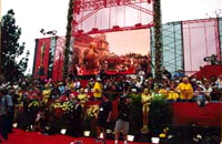 一昨年までは会場付近の歩道にテントを張って並んでいたが、去年から禁止となり、歩道を追い出されてしまった。そこで彼らは、泊まり込み中に顔見知りになったシュラインオーディトリアム前の住宅のオーナーに訳を説明し、前庭でキャンプをして開場を待ったとのこと。今年も歩道での泊まり込みが禁止されたので、再びその家の前庭でキャンプして一番乗りを目指していた。「オスカー・チャッター」のアカデミー賞一般席一番乗りは、誰でも参加OKだ(詳しくはhttp://www.oscarchatter.freeservers.comまで)。来年、春休みを取ってやる? |