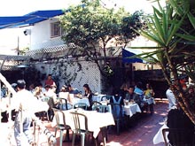 | 店頭の歩道に設置されたテラス席、オープン当初からある入り口エリアのテーブル席、そして、奥のパティオ席、その隣のプライベートパーティールームと迷路のような店内。天候によってはクローズしてしまうが、パティオ席では、毎晩8~11時に占い師が各テーブルを回って占いのリクエストに応えてくれる。 |