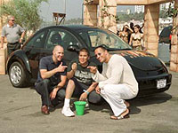 ステージ中央の砂時計を回転させて、いざ宝探しのゴングが鳴ると、約100人の参加者はわれ先にと会場入りし、サンタモニカ海岸の砂浜に埋まる宝探しに熱中。砂の中には、DVDやビデオ、プロモーションアイテムなど100以上の当たり券が埋められいたので、5つも掘り当てた人もいれば1つだけの人もいたようだ。一番の豪華賞品は、2002年型のフォルクスワーゲンビートル。「キー」と書かれた紙を発掘した9人がステージ前に集まり、1人ずつバケツの中のカギを拾い上げ、アーノルドとザ・ロックが見守る中、車のドアの鍵穴に差し込む。結局9人目の男性のキーが本物で、持っていたキーを回し軽快なエンジン音を響かせた。 |