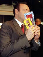 | 持参のお菓子で顔を隠してお茶目なポーズをするオスカー俳優K・スペイシー |