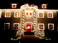 クリスマスイブ。日本では「恋人と過ごすロマンチックな日」という、一人モノには非常にありがたくない風習ができあがってしまっているが、こちらアメリカのクリスマスは全く異なる祝い方をする。信仰心の強いクリスチャンたちは、家族とともに一日を過ごし、主キリストの生まれたこの日を心から祝うのだ。日本でいう正月三が日のように、25日当日はどの店もレストランも休みとなり、テレビでは「行く年来る年」さながらに「クリスマスキャロル」が放送される。この時期になるとクリスマスソング以外は流さないという筋金入りクリスチャンラジオ局も登場、その祝い方はハンパじゃない。そしてこのクリスマスの一番の名物が、街中の家で見かけるクリスマスデコレーションだ。 |