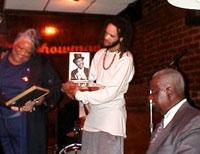 そして誕生日プレゼントに伝説的タップダンサー、ビル・ボージャングル・ロビンソンが最後のステージで履いていたタップシューズを贈られて感激するセヴィオン。「これ履いてもいいのかな」というセヴィオンにみんなが「君のものなんだから好きにしていいんだよ」というなんだか可愛い一幕も。この天才タップダンサーを生んだ母であり女優のイベット・グローバーも「神様が何故私を選んだのか計り知れないわ。でもわたしが彼を生み出したのよ」と誇らしげにスピーチ。そのあとはもちろんセヴィオンのオンステージとなった。間近で観る彼のエネルギッシュでいて繊細なタップはあまりにもエキサイティング。レジェンドが紡ぎ出される瞬間を観てしまったという気がする。超大物スターにしてはささやかなバースデイパーティだったけど、セヴィオンを心から愛してやまないハーレムの人々に囲まれてのアットホームな雰囲気は2ミリオン以上の価値がある、なんて思ってしまう。そういえばクリントン大統領就任記念式典でもセヴィオンはパフォーマンスしてたけど、今回はいったいどうなるんでしょうか…。 |