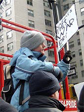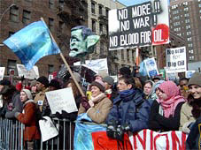 2月15日、米英によるイラク攻撃反対のデモが世界60ヶ国で繰り広げられ、1,000万人が参加した。ニューヨークでも氷点下5度の厳しい寒さをものともせずデモは決行され、演壇には活動家としても知られる映画スターが次々と立ち、平和へのメッセージを訴えた。 |
