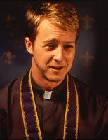 | ここ数年で、ノートンはひねくれて虐待された者の演技はお手のものであることを証明した。でも、新作の『僕たちのアナ・バナナ』でのノートンは、少々趣きが違うようだ。彼の監督デビューとなるこの作品で、ノートンはおっとりして、誠実で、理想主義者の若い説教師を演じている。「この作品は『フィラデルフィア物語』('40)みたいなロマンティックな三角関係の物語だ。普遍的なユーモアもふんだんに入れたよ。僕らくらいの年齢の人間なら身に覚えがあることや、とりわけ親に厳しく宗教的しつけを受けて育った人にはよくわかるユーモアをね。脚本にもかかわったし、とても思い入れのある作品なんだ」 ノートンのイェール時代からの友人である脚本のスチュアート・ブラムバーグは、ノートンはこの役にぴったりだったという。「エドワードを良く知っている人間はみんな、彼のことを愛嬌のあるオタクだって思ってるんじゃないかな。むしろ、彼があんなに恐い役ができるということの方が驚きだったね。実際の彼はひょうきんなヤツだよ。だから、ドラマとコメディの要素のある映画に絶対フィットするって思ったんだ」 | ||||||||||||