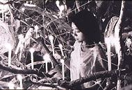 | パートカラー、及びセピア掛かった色彩で構成された映像や構図は、映画評論家の佐藤忠男氏をして「よほど時間をかけて徹底的にねばっても容易に撮れるものではない場面がいっぱいつまっている」と言わしめたほど。その秘密のひとつとして、白黒ネガの使用が上げられます。白黒ネガは現状の日本映画ではほとんど使われていません。それ故、技術的に苦労も多かったようですが、完全なるモノクロの色彩をスクリーンに映し出すことによって、生活においてカラーに慣れている私たちのイマジネーションを喚起し、真の意味で映画を制作者と観客が共有するという意図に基づいて実行されました。また、照明にも気が配られ、基本的に撮影のための人工照明は使用されていません。これにより、絵画的な映像が創造されたわけです。こうした頑固なまでの監督はじめスタッフの姿勢があってこそ、この深みある映像美が構築されたのです。 | ||||||