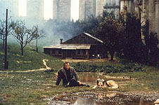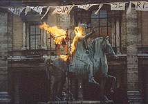 ドメニコはローマのカンピドリオ広場のマルクス・アウレリウス皇帝の騎馬像の上で、世界平和を訴え、わが身に火を放つ。一方、アンドレイはドメニコとの約束を果たしにバーニョ・ヴィニョーニに引き返す。アンドレイはロウソクの炎を、吹きすさぶ風から必死に守りながら幾度となく、ぬかるむ広場の横断を二度、三度と試みる。そして、ついに渡り切ろうという時、凍てつく雨は雪に変わり、彼は崩れ落ちて行く…。 |