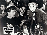 フェリーニが幼年時代に愛してやまなかった旅回りの芸人一座を背景に、大道芸人ザンパノ(A・クイン)に買われて翻弄される知恵遅れの女ジェルソミーナ(G・マシーナ)の無垢な魂の輝きが描かれている。フェリーニの最高傑作とも称される名作。 |