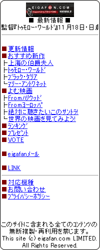 「EIGAF@Nモバイル」がパワーアップ・リニューアル! 映画最新情報、人気コラム、ランキングが、かなり充実しています。もちろん 3キャリア対応(iモード、EZウェブ、ボーダフォンライブ!)。